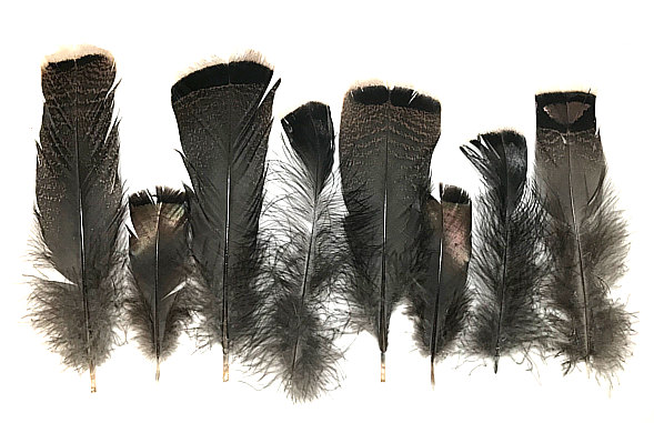 Mixed Turkey Skirts, Roughs, Flats, and shoulder feathers. Sold in half pound increments.